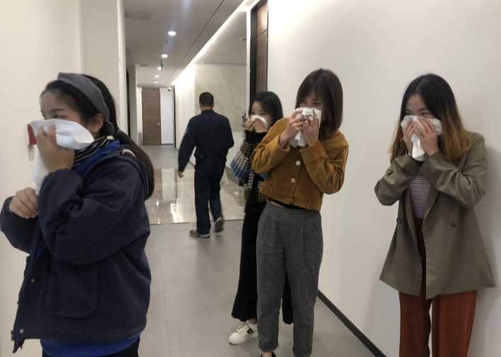 連忙通知AB辦公區(qū)人員,大家扔下手上的工作開始慢跑,畢竟是演習是吧!筆者在A區(qū),跑到男廁所附近的安全通道開始下樓,煙很大,雖然是演習無毒煙,但仍然有一些嗆人,可視度很差,只能看到半米處前面的伙伴,開始大家還排成兩行,走了一層以后,發(fā)現(xiàn)的確太危險,因為看不清楚路,于是并成一排,靠在有護手的這一邊整齊下行,這時真的很慢了,想快也快不起來,而且已經有伙伴開始咳嗽了!我提醒前面的伙伴可以用衣服和圍巾當口罩會好一些,但感覺更慢了。大家走的急,走了N圈以后,我自己也不知道是到幾層了。